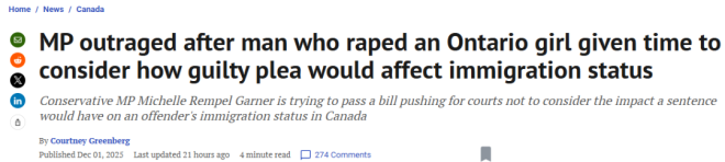 她稱其為“不公平”,並列舉了近年七起非公民罪犯獲得“寬鬆刑罰”的案例。其中包括一名20歲、以學生簽證在加拿大居住的印度男子。據《國家郵報》十月報道,他曾對四項偷窺罪名認罪。
