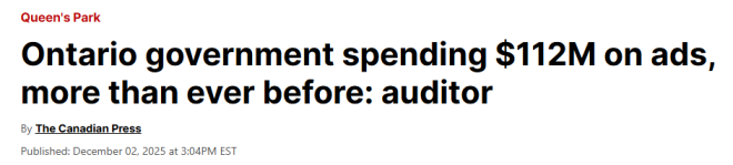 审计长雪莉·斯宾斯(Shelley Spence)在最新年度报告中列出了这笔开支,指出这一数字比前一年政府广告支出的纪录高出840万加元。报告深入分析了2024-25财年开支,包括上届省选前的几个月,当时进步保守党赢得了连续第三个多数政府。