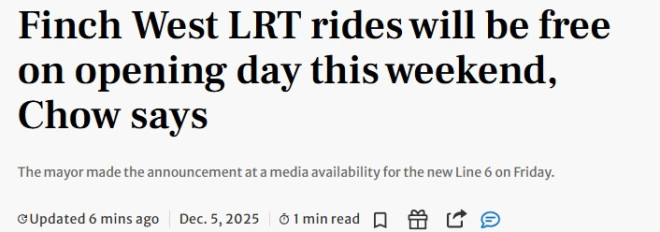 为庆祝备受期待的Finch West轻轨(LRT)开通,市长邹至蕙(Olivia Chow)已宣布,12月7日本周日全天,乘客可免费搭乘该线路。