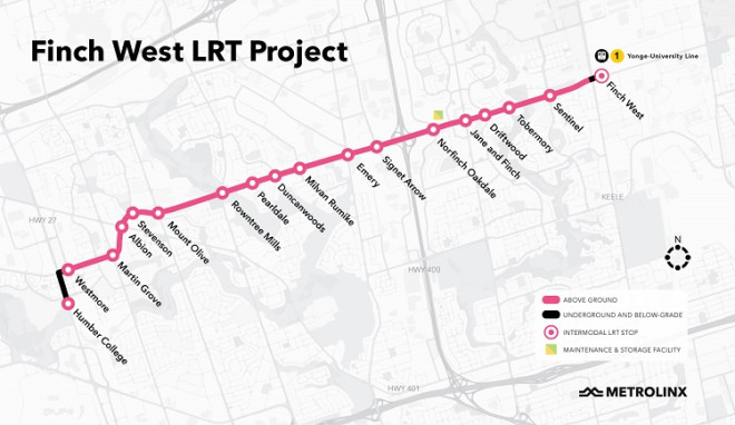 该线路沿Finch Avenue West设置18个站点,连接1号线(Yonge–University)上的Finch West站,一路开到 Humber Polytechnic北校区。