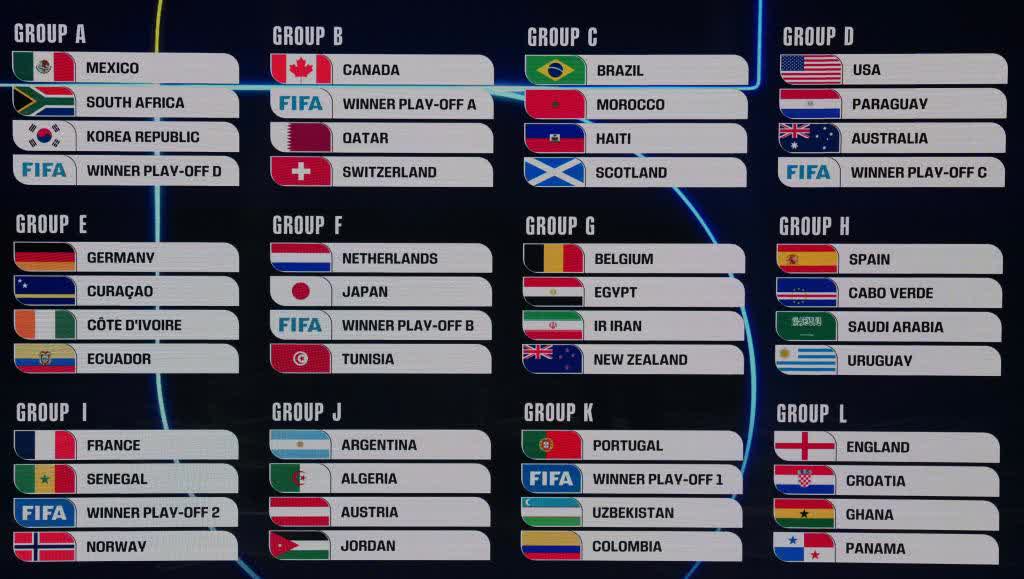 本屆世界盃首次擴軍至48支球隊,分為A至L共12個小組。東道主球隊美國、加拿大和墨西哥以及世界排名前九的球隊為種子隊,其餘球隊根據世界排名依次分檔。四支歐洲區附加賽球隊和兩支洲際附加賽球隊自動分入第四檔。