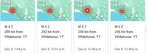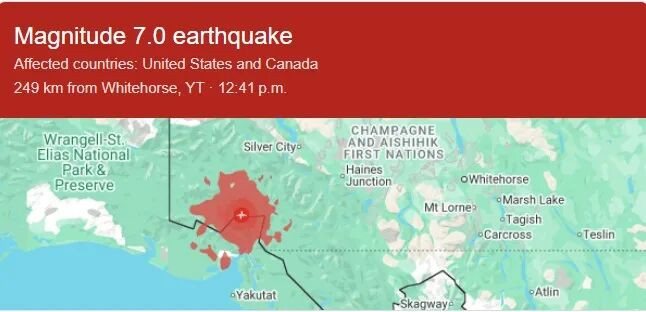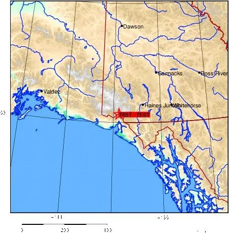 这场7.0级地震于当地时间下午1点41分(太平洋时间12:41分)发生在育空地区,震中位于距离白马镇(Whitehorse)约250公里的西部。