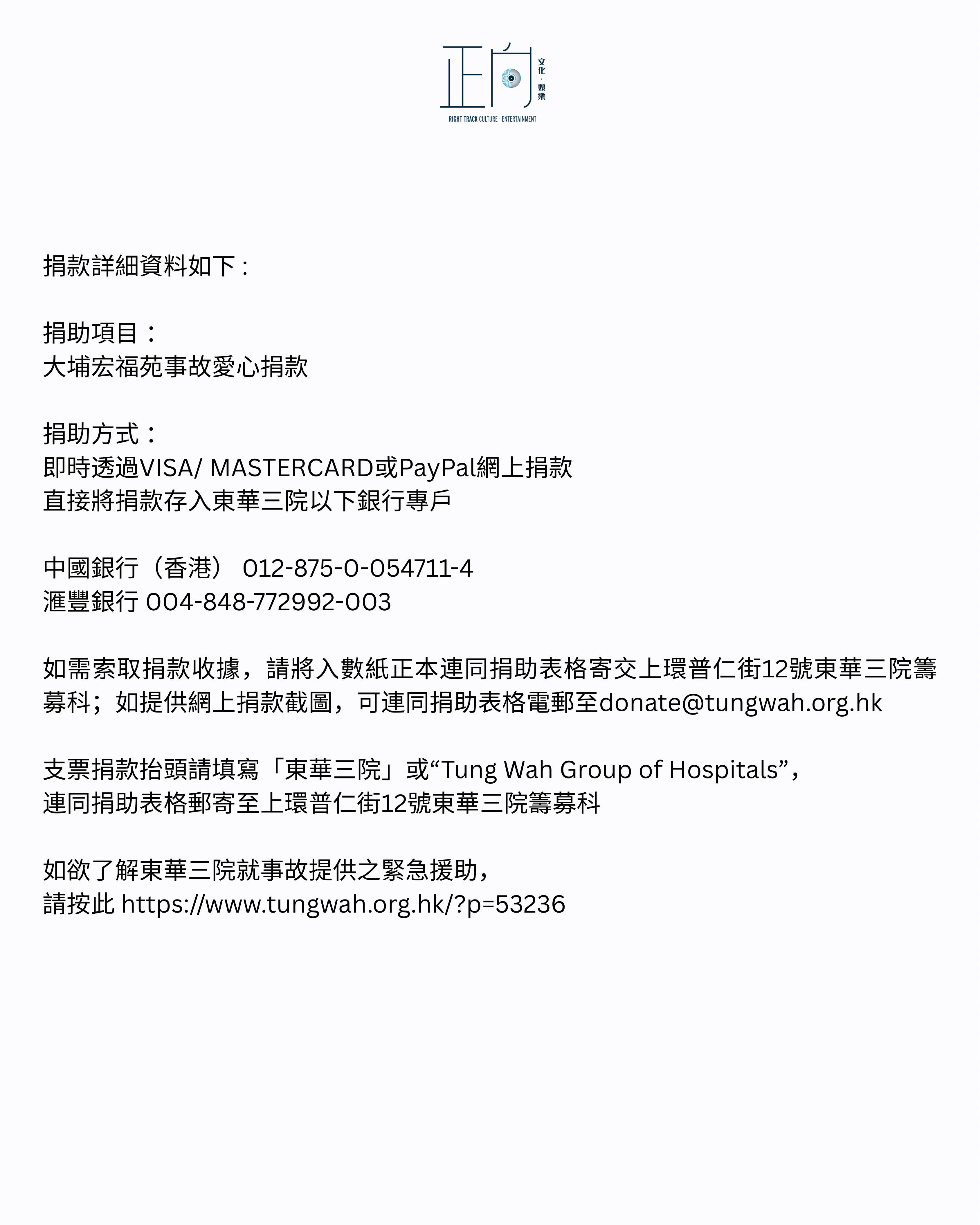 主辦方亦表示,將捐贈首場收益及周邊產品所有盈利。首場演唱會收益以及六場演唱會的周邊產品全數盈利,將撥捐東華三院,支援火災救援及災後重建工作。