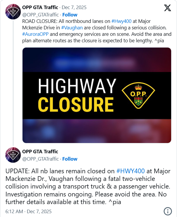 省警在清晨5点前不久发布的社交媒体帖文中说,一辆运输卡车与一辆乘用车在Hwy 400与Major Mackenzie Drive路段发生碰撞。