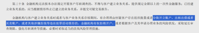 新规禁止匿名、假名账户,也禁止为身份不明客户提供服务。金融机构一旦发现分批开户、账户出租买卖或其他疑似洗钱行为,可拒绝业务或延长审查。