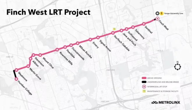 这条全长10.3公里、设有18个站点的轻轨,将连接多伦多北边的怡陶碧谷北(Etobicoke North)和一号线(Line 1),沿 Finch Avenue West 从基尔街(Keele Street)一直延伸到27号高速公路(Highway 27),终点站是汉伯理工学院(Humber Polytechnic North Campus)。