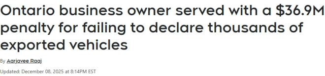 加拿大边境服务局(CBSA)已向一名安省商户开出3,690万加元的罚单,原因是其涉嫌未申报超过2,300辆从加拿大出口的二手车辆。