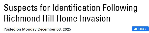 针对上周列治文山发生的一起入室抢劫案,警方抢劫调查组(Hold-Up Unit)现在呼吁公众提供线索,并协助识别嫌疑人。