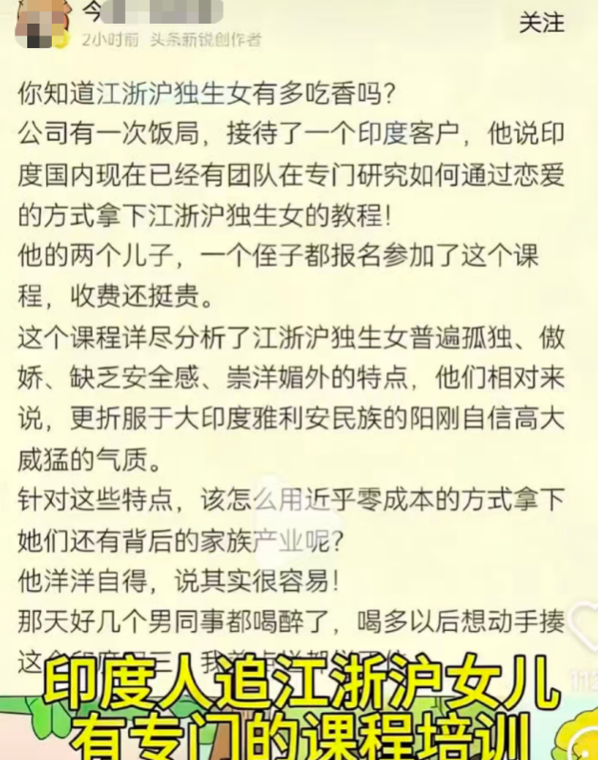据说,印度国内已经有团队开设专门的培训班,教男性如何通过恋爱手段“拿下”中国江浙沪独生女,最终目的是拿到对方家产。