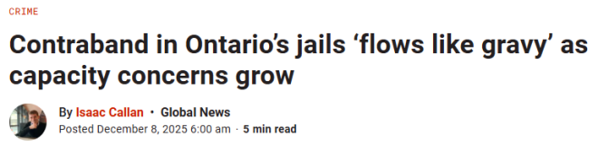 《Global News》根据《信息自由法》获得的数百页违禁品报告描绘了一幅画面:在这个监狱系统里,非法(从可卡因到MDMA再到芬太尼)经常被发现,同时还有武器和偶尔出现的科技产品。