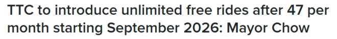 多伦多市长邹至蕙今天表示,从明年9月起,多伦多公车局(TTC)将引入一项“封顶票价”(fare capping)制度:当乘客在一个月内乘车次数超过47次后,之后的所有乘车将自动免费。