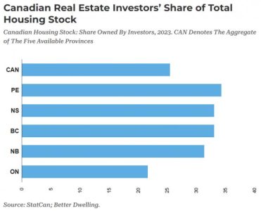 加拿大統計局旗下的加拿大住房統計計劃(CHSP)的新數據顯示,2023 年,大多數省份的房地產投資者占據了更大比例的全部住房存量。這並不令人意外,但真正令人震驚的是背後的數學:為了出現這樣的結果,投資者必須占據 3/4 的新增業主——而這一情況主要由安大略省推動,在那裡,投資者占 84% 的淨增長。