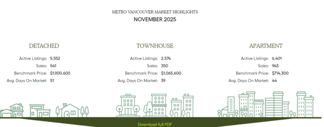 随着2025年接近尾声,大温地区(Lower Mainland)的房地产市场明显放缓,销量下滑、挂牌量持续攀升,也在两个地产局覆盖范围内普遍走软。11月的数据,基本延续了今年秋天以来的降温趋势。