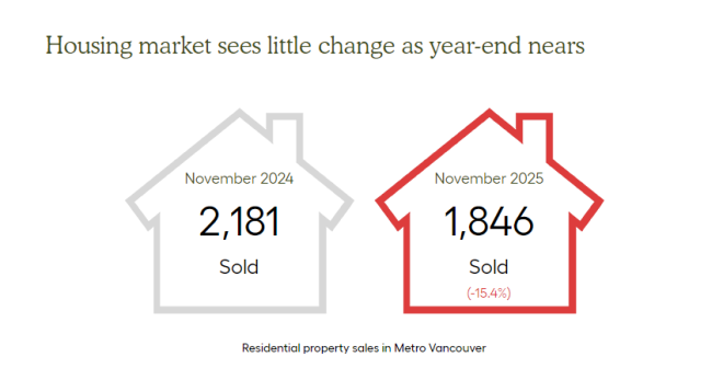 根据大温地产经纪协会(Greater Vancouver Realtors,GVR)的数据,2025年11月住宅成交量为1,846套,同比2024年11月下降15.4%,而且比过去10年的季节性平均水平低了超过20%。GVR首席经济学家Andrew Lis形容目前的市场氛围是:“买家耐心观望,卖家被迫适应多年未见过的市场环境。”