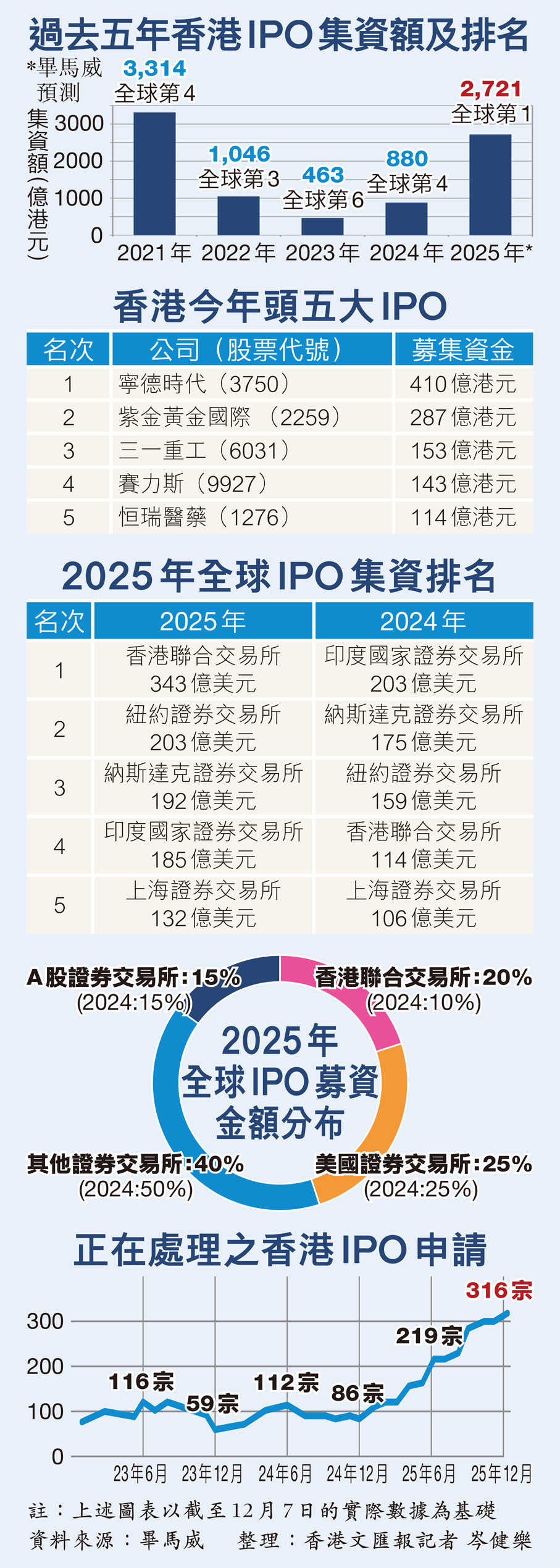 畢馬威昨日發布的統計顯示,今年全球IPO市場共籌集1,584億美元,上市宗數達1,227宗,募資規模和上市宗數分別按年增長18%及下降4%。香港位居全球第一,美國兩大證券交易所位列第二及第三,印度國家證券交易所及上交所則排名第四及第五。