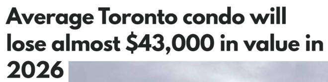 价格则预计将在新的一年继续“自由下落”,从2025年第四季度平均价格65.87万加元,预计下跌6.5%,降至约61.59万加元。这意味着公寓业主的平均资产价值将缩水约4.28万加元。