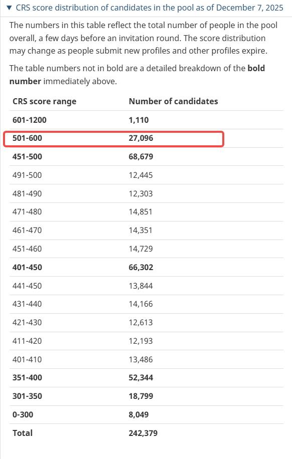 截止12月7日,EE候选池内还有27,096名501-600分的候选人。