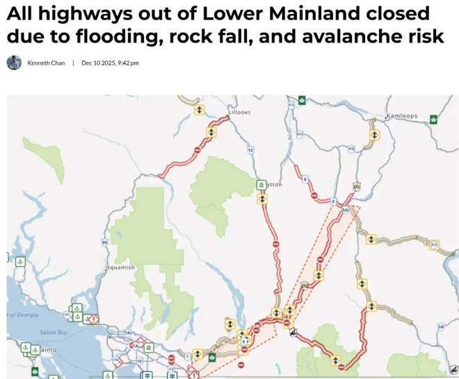 对普通人来说,这意味着什么?就是你几乎找不到能离开大温的路。连省交通厅都直接表示,现在没有任何明确重开时间,只能等天气稳定下来再说。