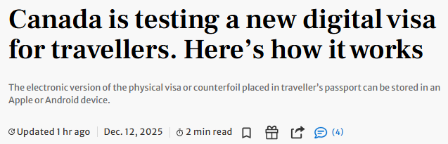 现在大家熟悉的加拿大签证,大多是护照里贴一张纸质签证贴纸(counterfoil)。而这次测试的数字签证,就是它的“电子版”。