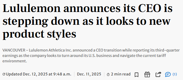 Lululemon Athletica Inc.在公布第三季度财报的同时宣布了首席执行官(CEO)人事变动的消息,该公司正寻求扭转其美国业务并在当前的关税环境下进行调整。