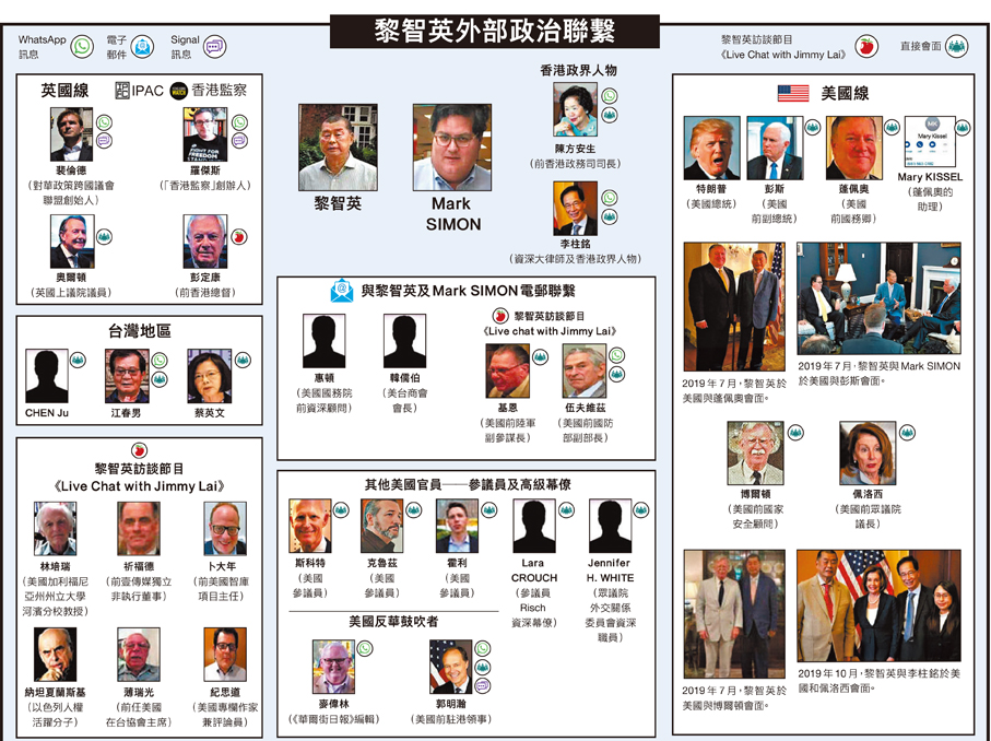 根據黎智英與助手Mark Simon之間的WhatsApp信息,知道Mark Simon致力為黎智英做事,包括嘗試安排黎與美國時任眾議院議長佩洛西、時任美國總統特朗普等見面。最終,2019年7月,黎智英與時任美國副總統彭斯、參議員會面,可見Mark Simon在黎智英與美國官員之間從中遊走,令黎智英向美國政府作出遊說、尋求支持。