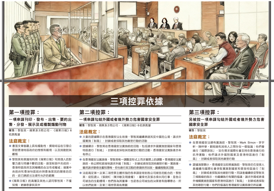 杜麗冰強調,法庭信納黎智英是指控串謀的主腦,在實行串謀行為時,利用《蘋果日報》的不同平台,並得到公司同意。法庭最終宣判,三項控罪包括串謀發布煽動刊物罪成,及兩項串謀勾結外部勢力均罪成。