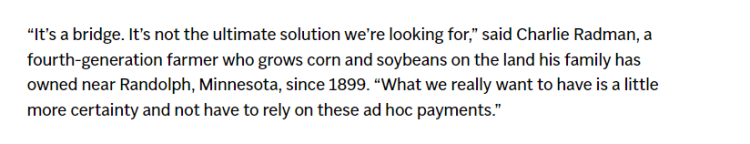针对政府的救助计划,报道援引一位名为查理•拉德曼的农民的话说,“救助措施只是一座桥梁,并非我们寻求的最终解决方案”。查理·拉德曼称,自1899年以来他的家族一直在明尼苏达州拥有土地,并在此种植玉米和大豆。他说,“我们真正想要的是更多的确定性,而不是依赖这些临时性的补贴。”