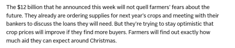 美联社的报道认为,新近宣布的120亿美元救助计划并不能消除农民对未来的担忧。他们已经开始为明年的作物订购物资,并与银行商讨所需的贷款。农民们依然认为,如果能找到更多买家,农产品价格将会上涨。