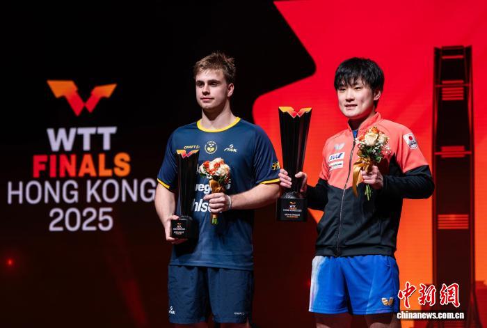 12月14日晚,世界乒乓球职业大联盟(WTT)香港总决赛在香港体育馆收官。在男单决赛中,日本选手张本智和4:2战胜瑞典选手特鲁斯·莫雷加德,获得冠军。图为张本智和(右)和特鲁斯·莫雷加德在颁奖仪式上合影。 记者 侯宇 摄