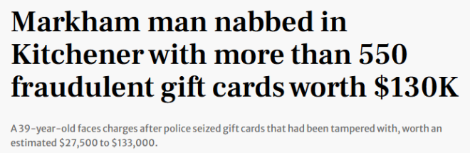 警员随即将该男子拦下,并从他身上查获了550多张来自多家零售商的礼品卡。如果这些卡被激活,总价值估计在2.75万到13.3万加元之间。