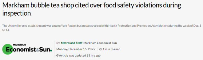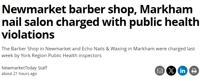近期,约克区公共部门(York Region Public Health)连续公布多起执法检查结果,多家华人常去的奶茶店、美甲店和理发店因违反公共卫生相关规定,被正式指控或开具罚单。