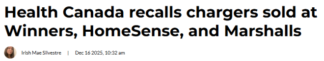 加拿大卫生部(Health Canada)正在紧急召回在Winners、HomeSense和Marshalls售出的数千个无线充电器,原因是存在起火及灼伤风险。