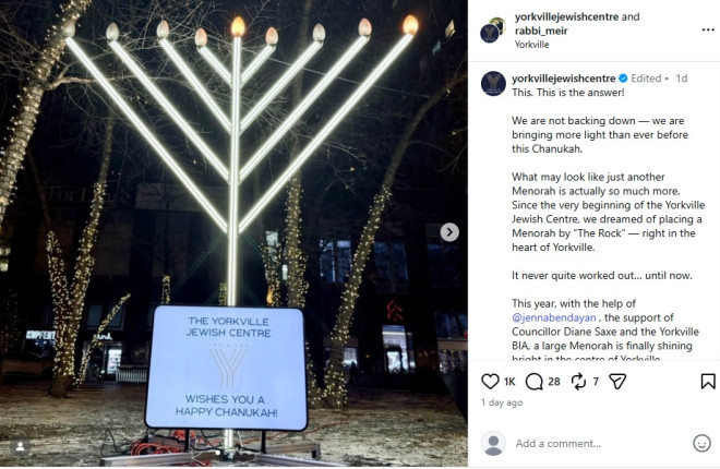 多伦多Yorkville犹太中心于昨晚在社区的核心地标“The Rock”旁竖立一座光明节灯台,并在社交媒体上表示,今年的光明节注定不一般。史上首次,全新的光明节灯台将点亮Cumberland街的地标 “The Rock”,把犹太的光与自豪带到Yorkville的正中心。