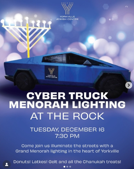 今年的庆祝活动阵仗全面升级,备受关注的Cybertruck光明节巡游车强势回归,同时将新增一辆超大型皮卡版巡游车,为Yorkville村的家庭点灯仪式注入更多音乐、欢乐与能量。此外,周四晚,多伦多最具人气的青年专业人士光明节派对也将全面升级。