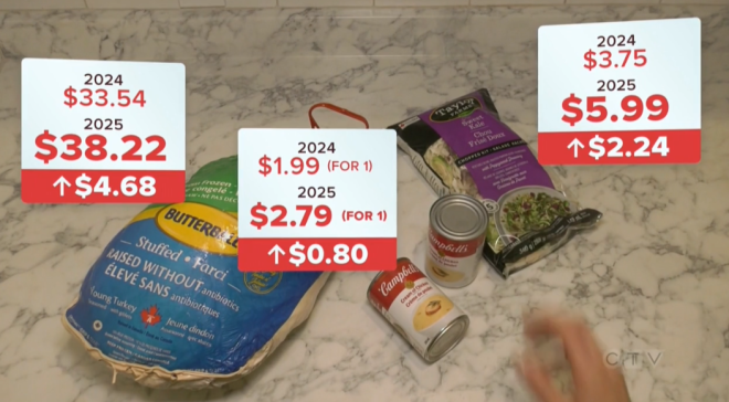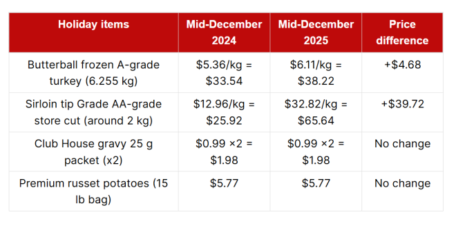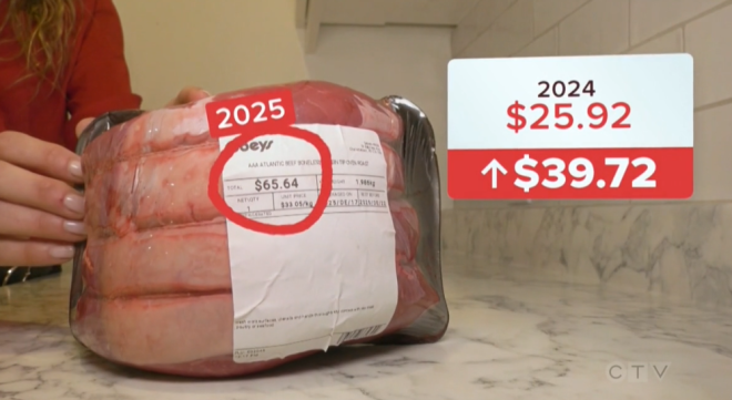 CTV News对比了本周一车常见节日食品的价格,与2024年同期进行比较,使用的是门店价格和存档的线上传单。对比结果显示,家庭整体支出更高,其中牛肉涨幅最为明显。