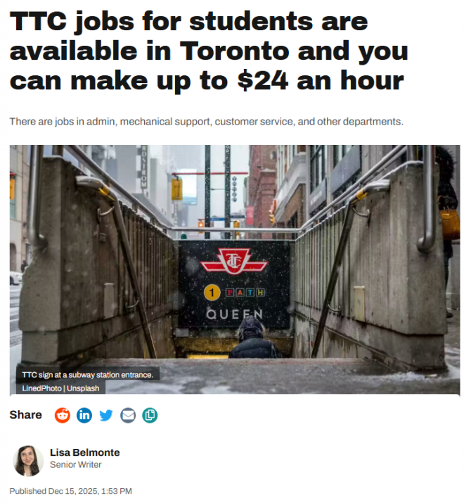 多伦多公车局(TTC)目前正在为2026年夏季学生项目(2026 Summer Student Program) 招募人员,岗位涵盖行政、客服、维修及其他多个部门,时薪最高可达24加元。