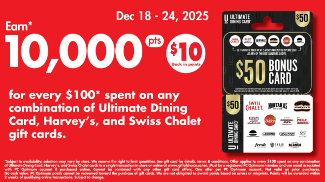 买$50刀餐馆礼卡,返10,000积分=$10,相当于8折,送礼、自用都很合适(活动时间12月18-24日)!