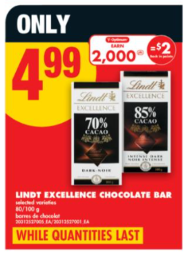 Lindt黑巧$4.99,返2,000积分=$2,相当于只要$2.99!