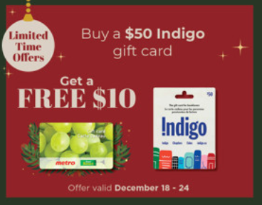 - 买$50刀Indigo礼卡,送$10刀超市礼卡;
