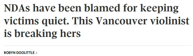 加拿大一名乐团前乐手打破保密协议,公开讲述了自己的投诉、和解协议以及随后职场中的遭遇,从而引发了性侵和骚扰案件是否应使用“禁止披露协议(NDA)”这一争议的讨论。