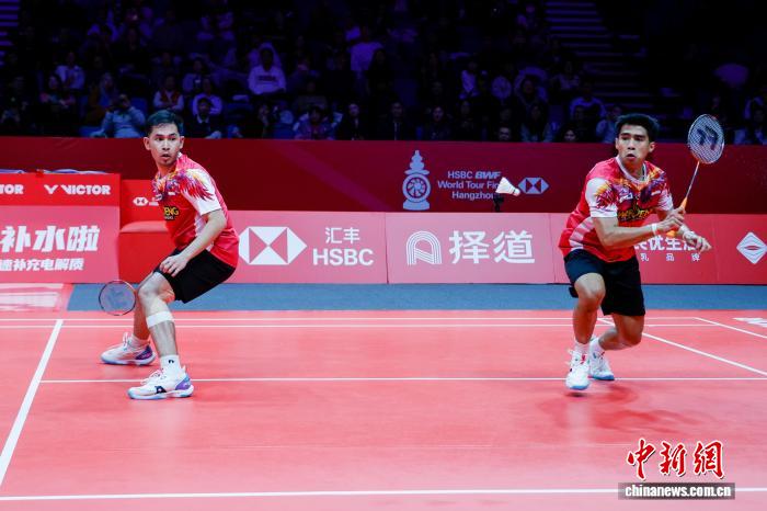 12月18日,2025汇丰世界羽联世界巡回赛总决赛在浙江杭州举行。在男双小组赛A组比赛中,韩国组合金元昊/徐承宰2比0战胜印度尼西亚组合咖塔曼/伊斯法哈尼。图为咖塔曼(右)/伊斯法哈尼在比赛中。 记者 肖健 摄