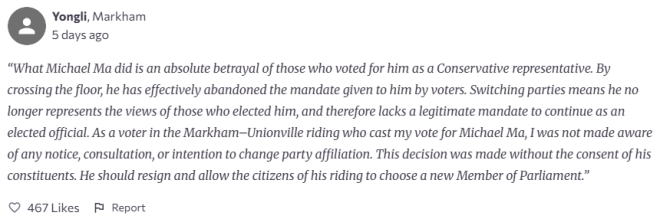 这是大多伦多地区(GTA)万锦—于人村(Markham–Unionville)选区的选民,对加拿大联邦国会议员马荣铮(Michael Ma)上周从保守党倒戈加入的评价。目前,已有超过3.7万人在一份请愿书上签名,要求他辞职。