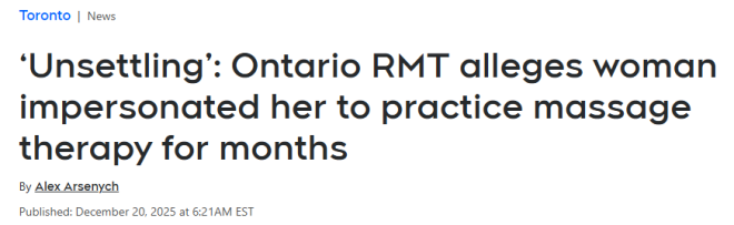 亚历山德拉表示,她随后向多伦多警方报案,正式提交了身份盗用的投诉。CMTO也发布了第一份警示公告,提醒公众有人冒充RMT,但当时还不知道涉事者的具体身份。