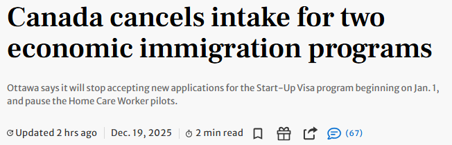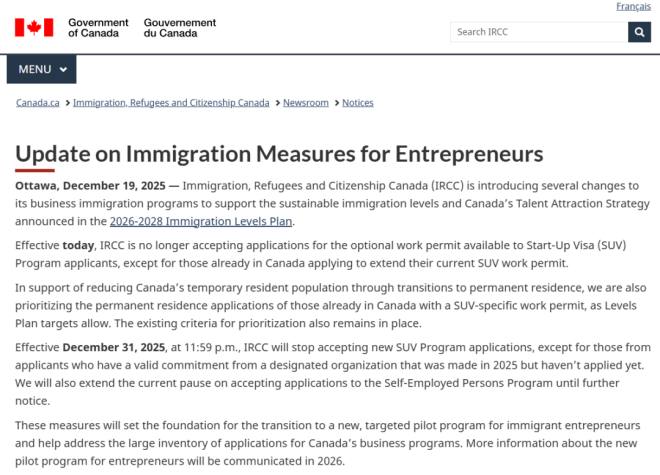 IRCC本周五(12月19日)发布最新通知,从2026年1月1日起,创业移民项目(SUV)将停止接收任何新申请。