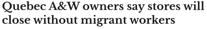 魁北克省的A&W特许经营商发出警告,除非联邦政府恢复对外籍劳工的使用权限,否则餐厅将被迫关门或大幅削减营业时间。他们表示,本地工人已经不愿意从事快餐行业的工作。