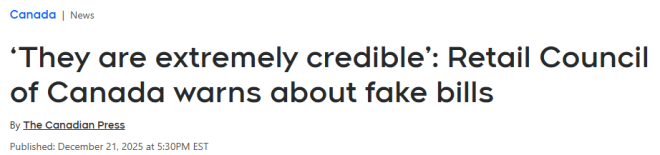“显然,这类情况很难量化。但假钞的数量确实在爆炸式增长,甚至连魁北克省警察都已经在部分地区张贴海报,提醒公众提高警惕,”他说。