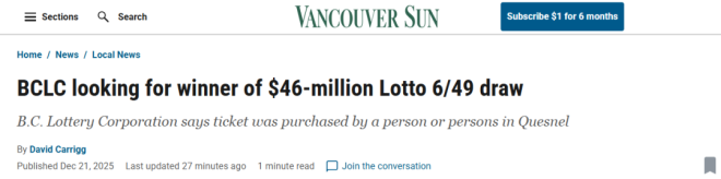 不仅是卑诗史上最大彩票奖,也是加拿大个人中奖最高纪录!
