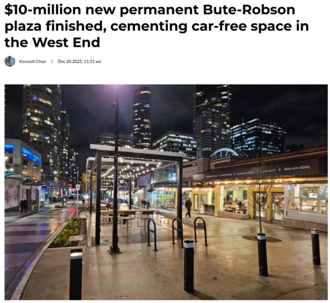 本周,赶在假日购物高峰到来之前,温哥华市政府正式向公众开放了已完工的 Bute–Robson 永久广场,将 Bute 街与 Robson 街交汇处,彻底改造成一个以行人为核心的开放式公共空间。