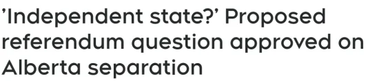 綜合報道:加拿大阿爾伯塔省選舉機構周一宣布,已正式批准一項關於阿省是否脫離加拿大、成為“獨立國家”的公投提問。