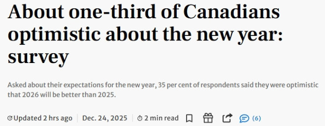 一项由Leger发布的最新民调显示,经济动荡、全球冲突以及气候变化引发的自然灾害,共同塑造了人对这一年的整体感受;而对2026年抱乐观态度的加拿大人,只有约三分之一。